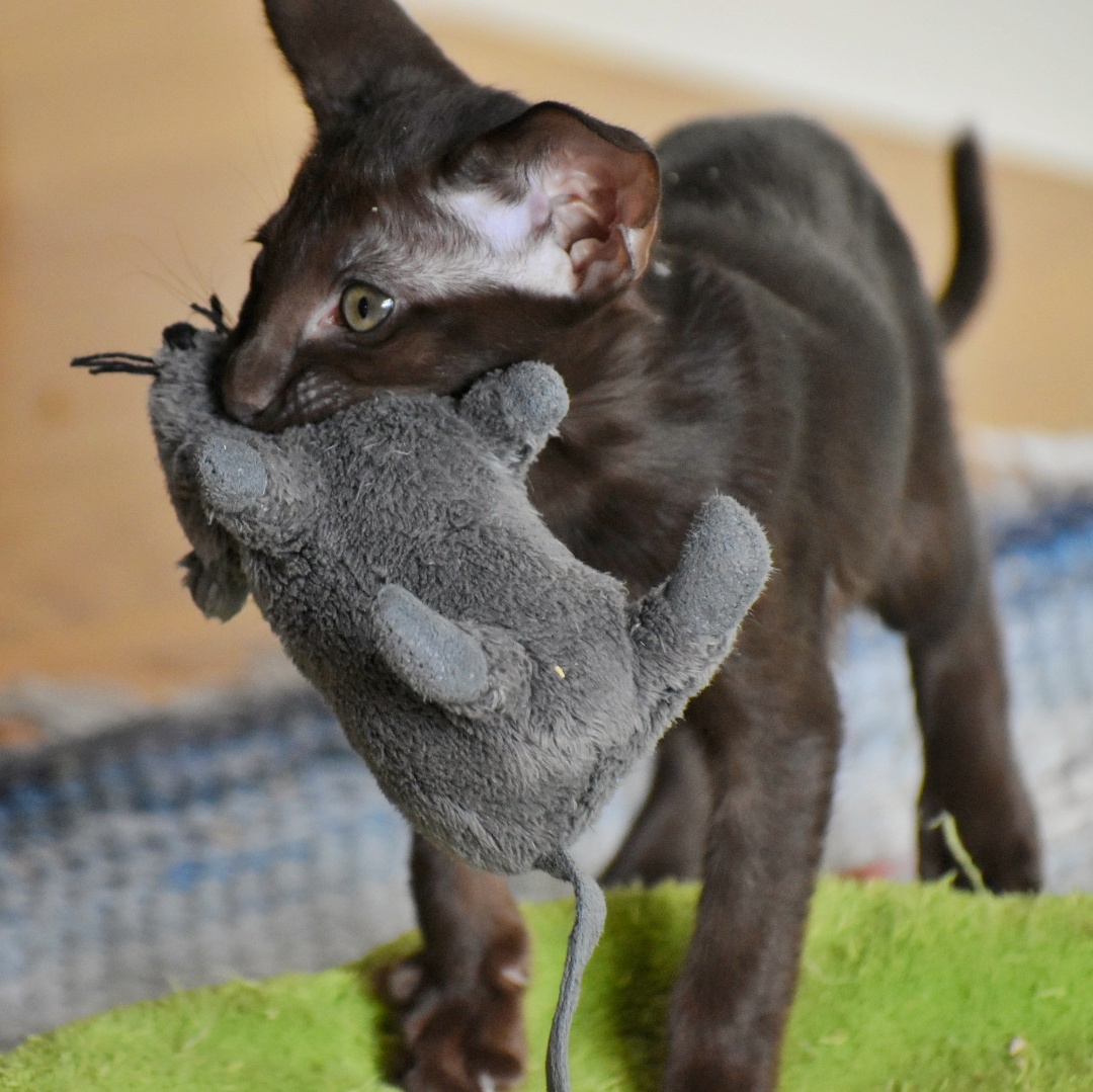 Cornelia är på flera sätt en favorit. Det var egentligen min ursprungliga önskan att ha en svart oriental och en choklad eller brunmaskad siames. Hon har de allra mest fantastiskt blåa ögonen. Hon är feminin och finlemmad som en älva men har visat sig vara en riktig liten vilde. Tuff och framåt och full av energi. Det gillar jag!