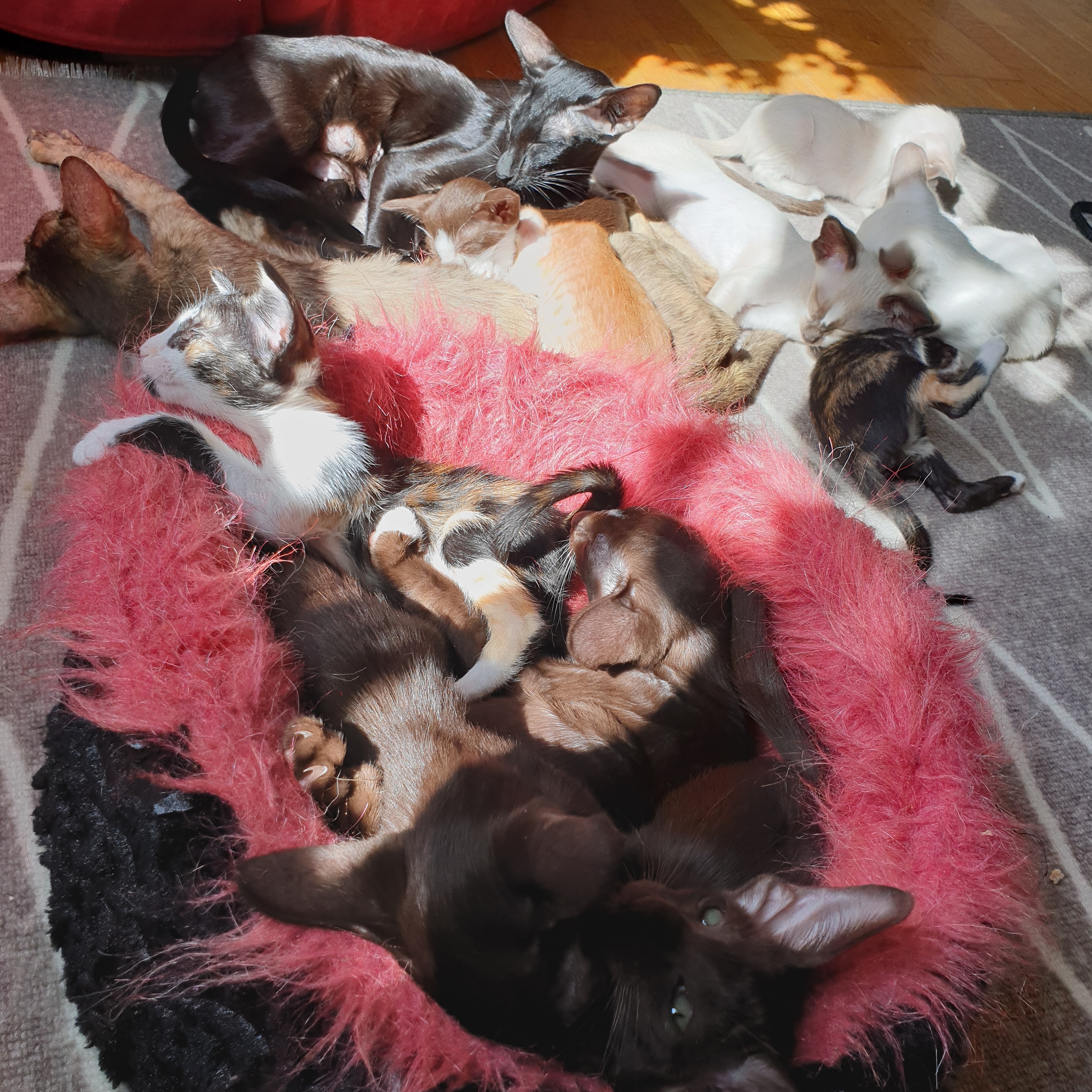 Ja nu är inte ens två hela veckor kvar tills Minis kattungar skall flytta hemifrån! Med tanke på att vi härbärgerar hela 12 kattungar borde det kanske kännas som en lättnad. Men det är förhållandevis riktigt lugnt och fullkomligt hanterbart med alla dessa katter. De tre mammorna har ett fantastiskt samarbete och alla är som en enda stor familj. Visst är de totalt vilda och galna periodvis, ruschar genom huset och klättrar i gardinerna!