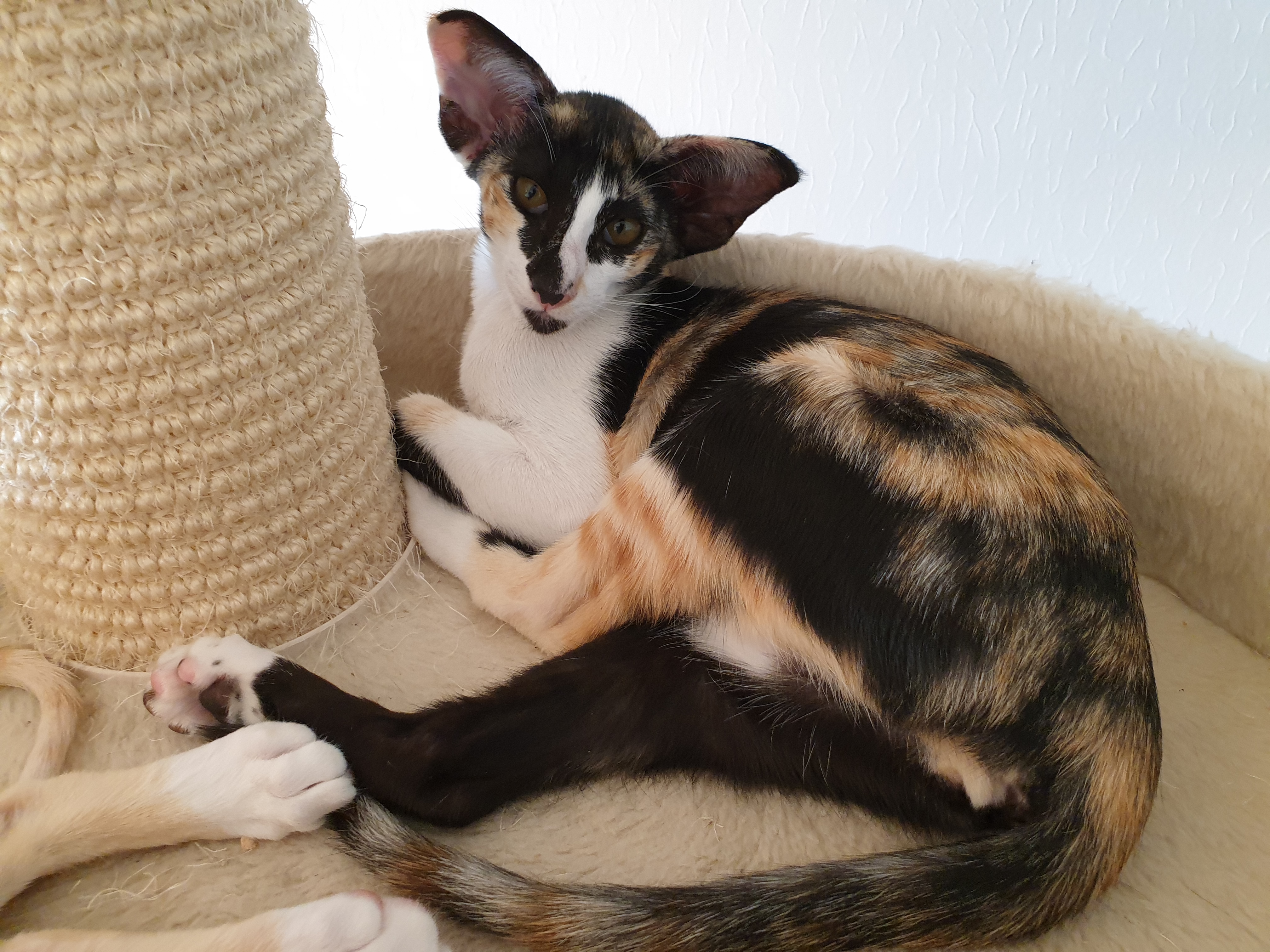 Väl framme möttes vi av en något förvirrad Crispin. Va, vad är nu detta, vad gör dessa HÄR, på mitt alldeles egna revir…luktar bekant, men på fel ställe. Edith vaknade raskt till liv och utan tvekan klev hon ur transportburen och inspekterade omedelbart sina nya domäner. Det var härligt att se henne så framåt. Hon accepterade sitt nya hem direkt! Fann burkmat på ett fat och slukade det utan att tveka. Fann allehanda leksaker och började genast leka med än det ena än det andra! Hon som inte varit så värst intresserad av leksakerna hemma!! Crispin smög efter med stora ögon, gömde sig bakom soffan och iakttog hur denna lilla bara flyttade rakt in bland hans grejer!