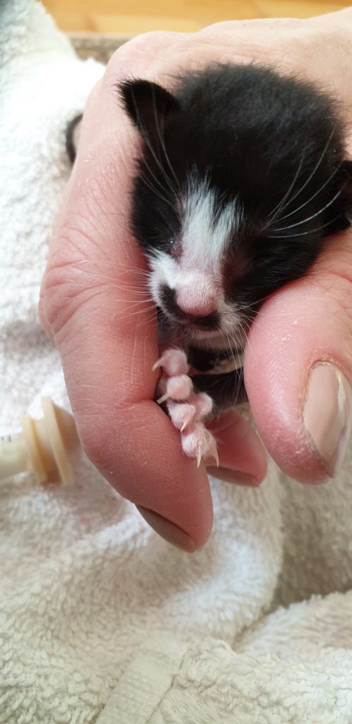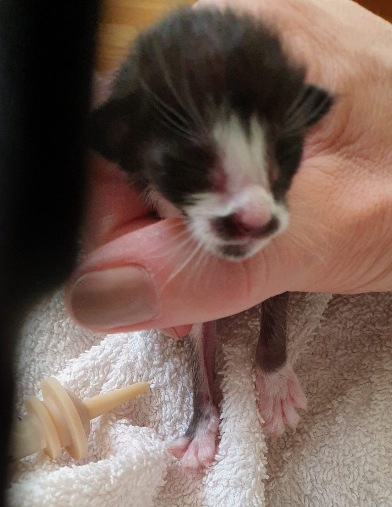 Det visade sig snart att den sista lilla skruttan inte fann kraft att äta. Hon sökte spenen men gav upp för lätt och orkade inte riktigt suga. Livet är bra skört i början. Det gäller att ha stenkoll, det går så snabbt utför. Man riktigt ser hur den lilla kroppen liksom torkar ihop, återtar fosterställning och blir tröttare och kallare. Man får agera på stört och försöka skaka liv i den lilla kroppen och hjälpa till att få fatt i en spene. Det är verkligen inte det lättaste. Det krävs energi även för att äta! Och de är bångstyriga de där små. De kämpar emot när man försöker vägleda dem och när man väl fått dem att ta en spene då brukar mammakatt få för sig att resa på sig eller behöva slicka sig nånstans och fördärvar alltihop!